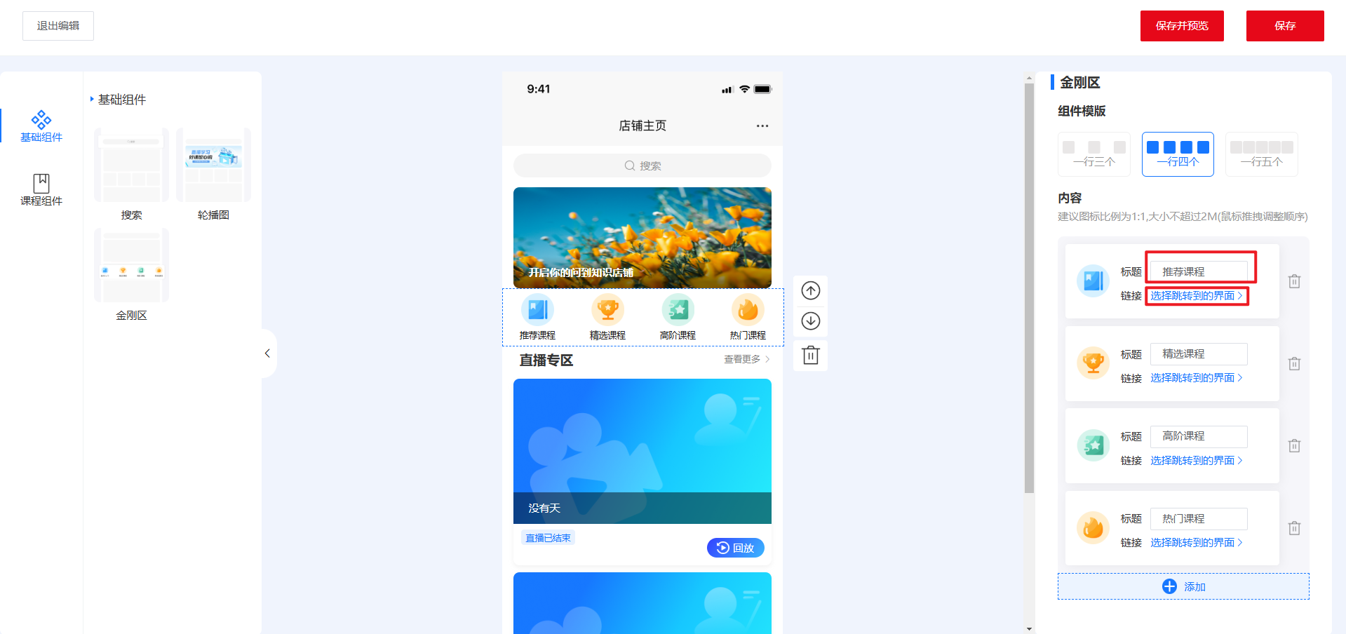 操作流程:老师后台进入编辑页面—> 基础组件 —> 金刚区(将金刚区组件拖拽到店铺主页)