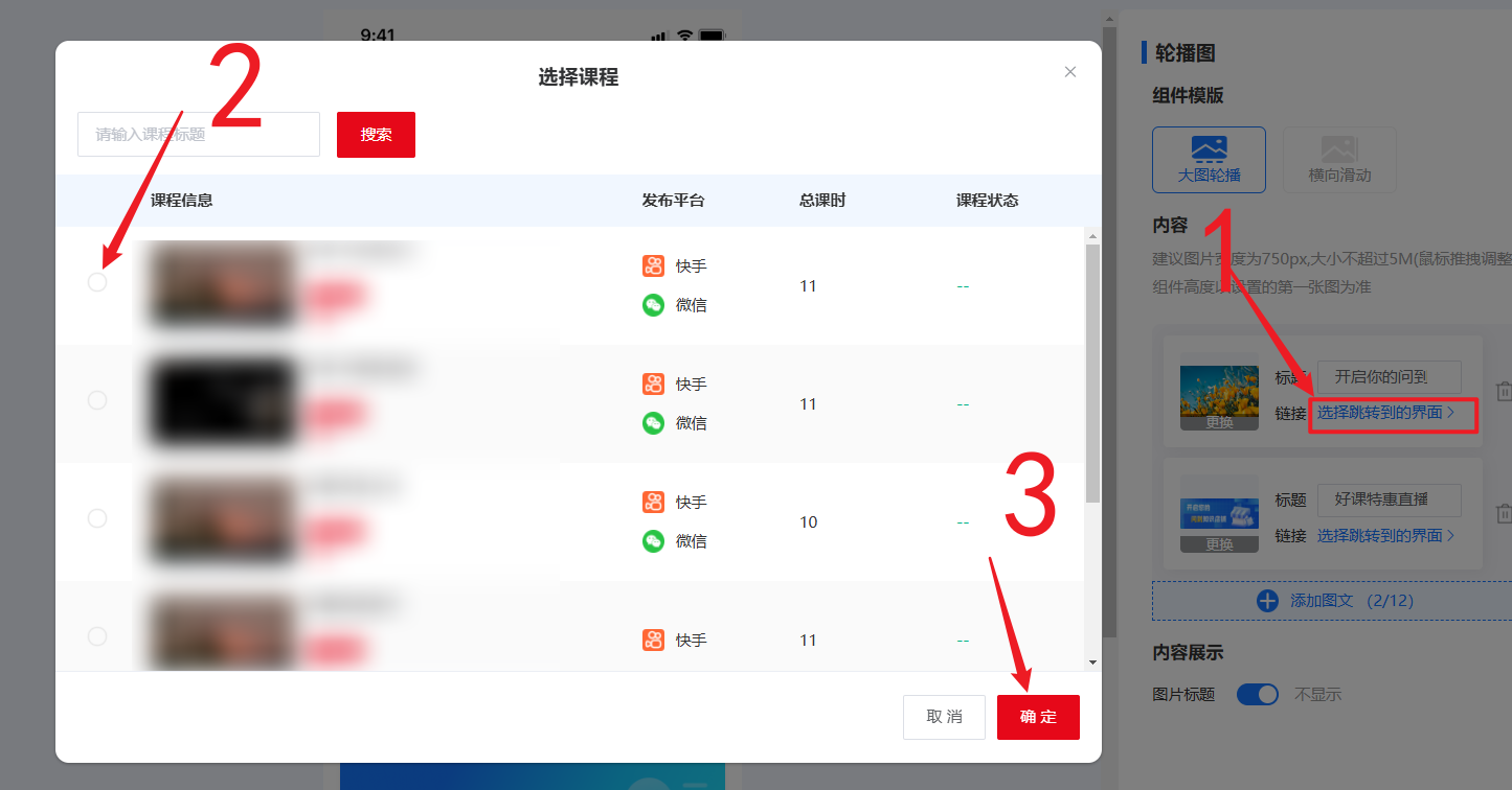 - 跳转链接:跳转到某一课程(点击选择跳转到的界面—> 选择课程课程—> 确定)用户点击图片可以跳转到设置的课程