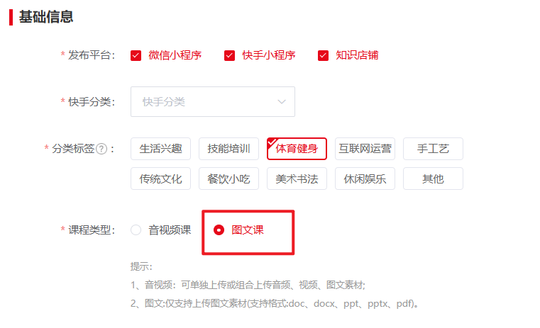 - 快手发布课程需要额外填写老师介绍、课程大纲、面向人群、学完收获,其他平台不用