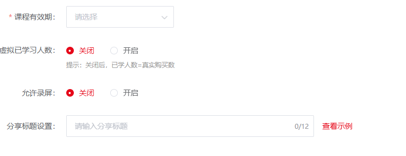 - 虚拟已学习人数:关闭或者开启(开启后输入人数,则会在课程详情展示设置已学习人数)