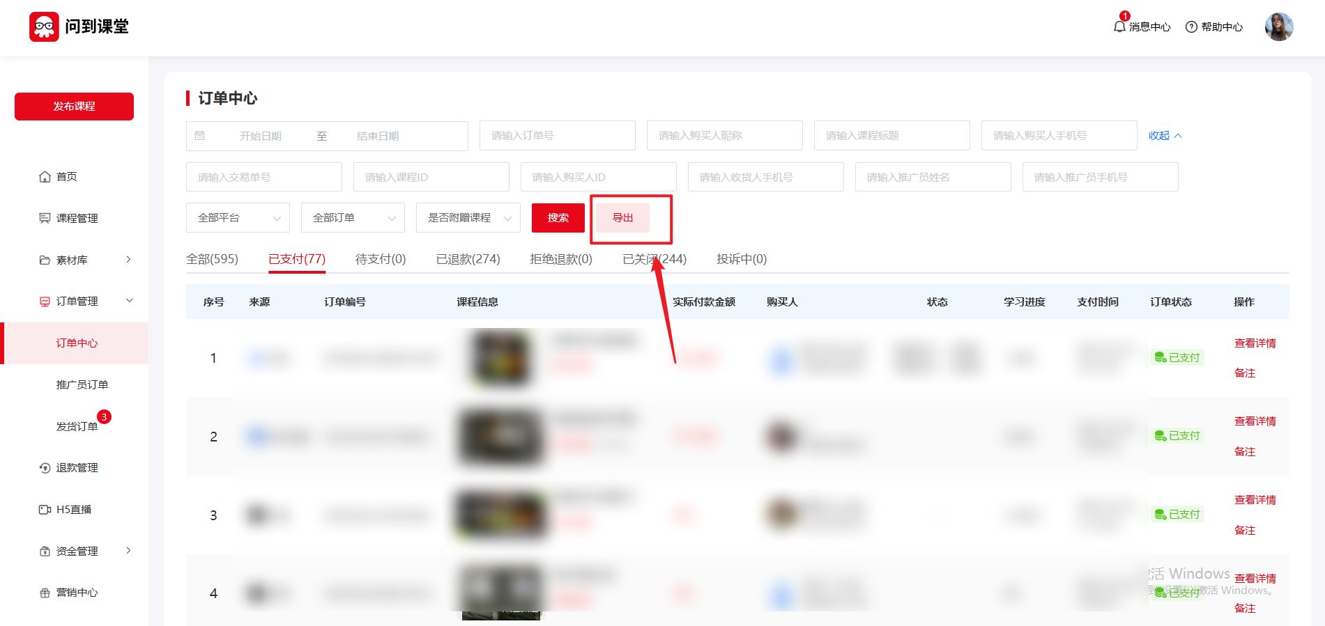 视频号、小红书只有微信看课链接 抖店拥有微信及抖音看课链接 操作步骤:登录老师后台——>订单管理——>订单中心——>点击看课链接——>复制