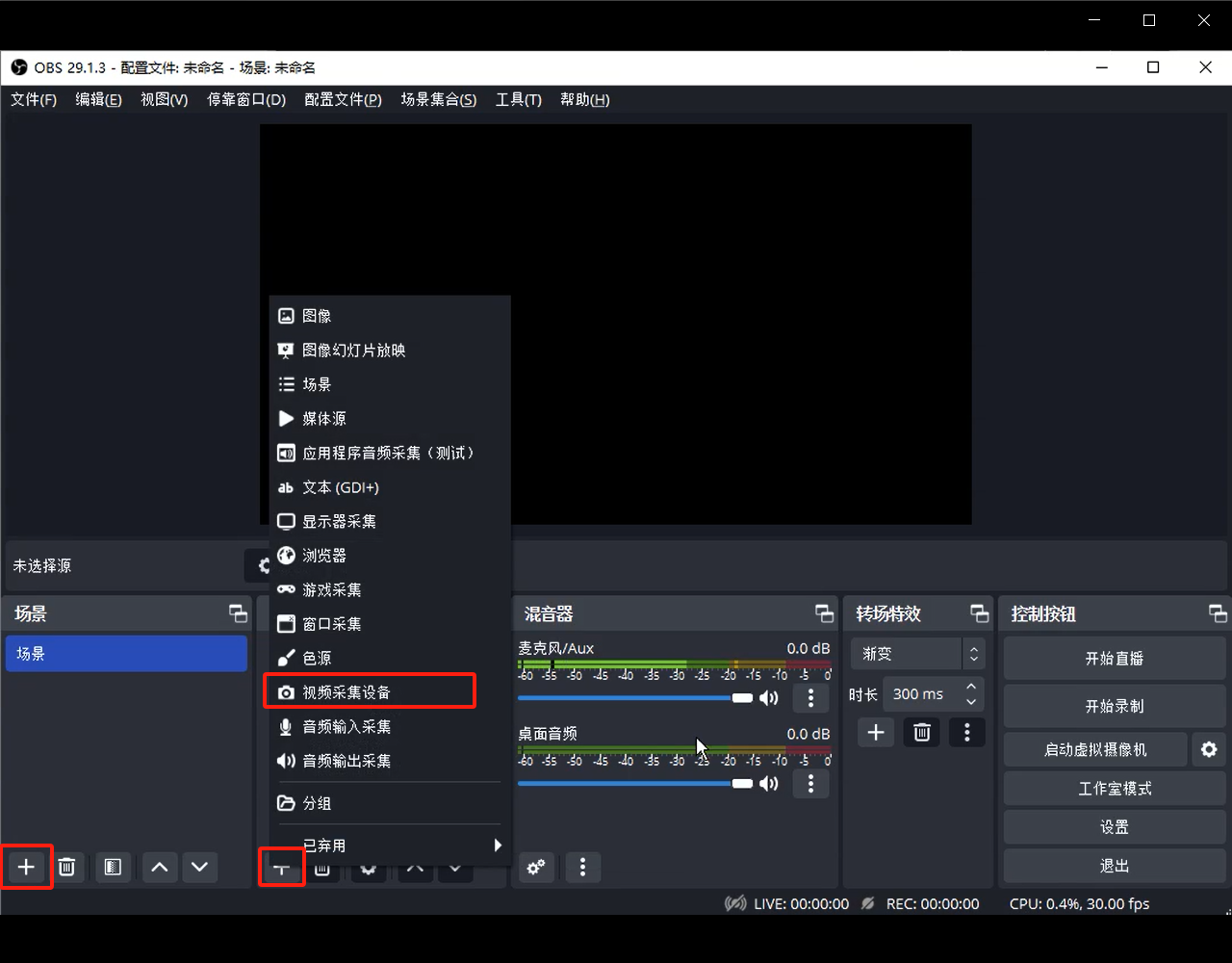 在场景处点击“+”添加一个场景,在来源处点击“+”,在弹出的列表中选择“视频采集设备”(低版本 OBS 可能显示的是“视频捕获设备”是同样的按钮,也是同样的操作)