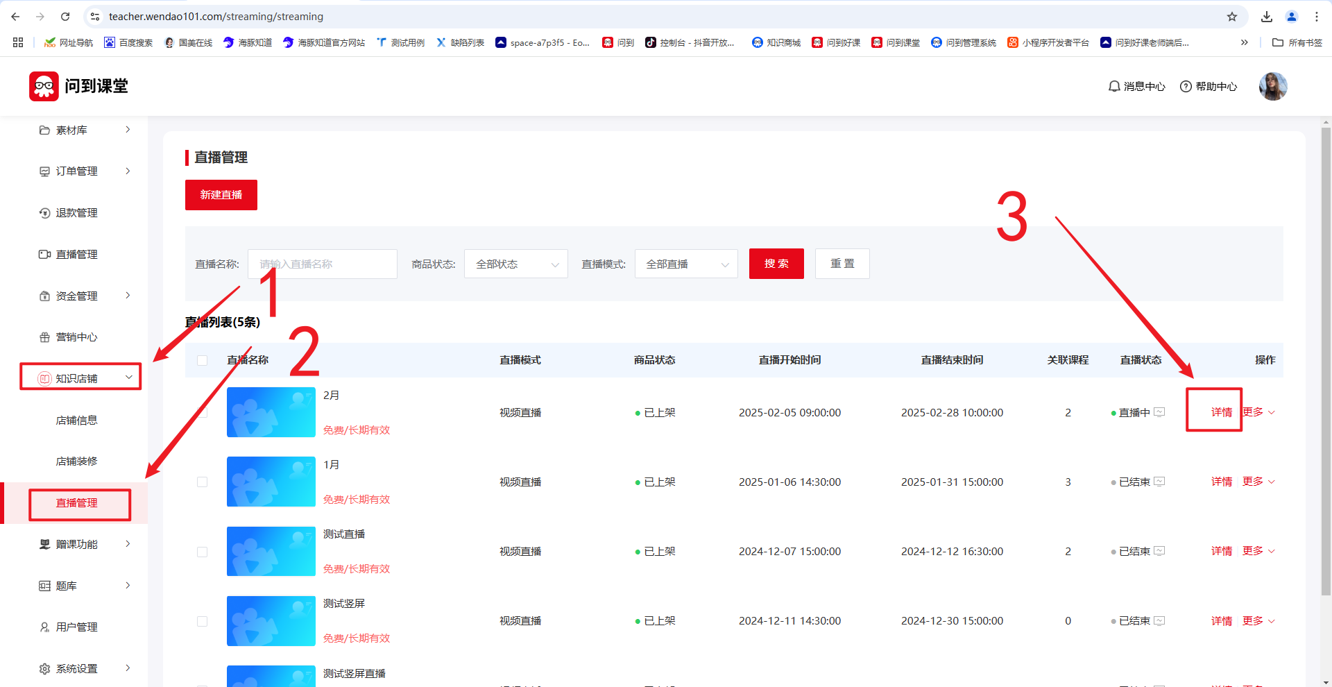 老师后台 → 直播管理(私域在知识店铺-> 直播管理)-直播详情中,下拉到底复制,第三方推流到直播间,复制直播的服务器与串流密钥;