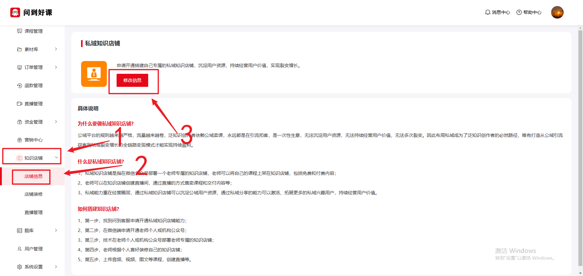 操作流程:知识店铺—> 店铺信息—> 修改信息—> 复制知识店铺域名—> 使用手机浏览器或手机微信打开链接—> 登录私域店铺—> 找到对应直播间—> 点击右下角分享直播间—> 浏览器可以下载海报,发送海报给学员(微信可以下载海报也可以直接点击右上角三个点直接发送给微信好友)