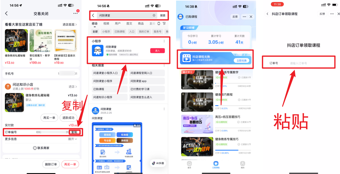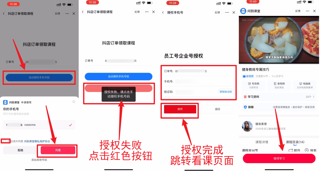 操作路径:购买课程后,点击订单详情——找到订单号并复制——抖音搜索【问到课堂】小程序——点进进入,进入首页后——点击下方导航栏已购课程——点击抖店课程兑换——输入订单号——点击授权手机号——如无法授权,下方会弹出手动授权手机号码红色按钮——点击按钮跳转到短信授权页面,填写手机号、验证码后点击授权——授权完成后跳转看课页面。下次看课,搜索【问到课堂】小程序,点击已购课程,点击相应课程就可以观看了