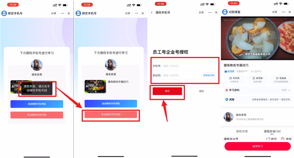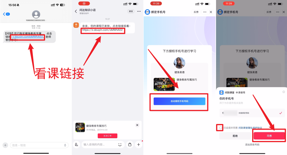 用户购买课程后会发送短信到用户填写的手机号上,用户可点击短信链接跳到课程授权页面(如果收不到短信,可联系抖店客服要看课链接,点击客服发送的链接也可以跳到授权页面)——进入授权页面——点击授权手机号——如无法授权,下方会弹出手动授权手机号码红色按钮——点击按钮跳转到短信授权页面,填写手机号、验证码后点击授权——授权完成后跳转看课页面。下次看课,搜索【问到课堂】小程序,点击已购课程,点击相应课程就可以观看了